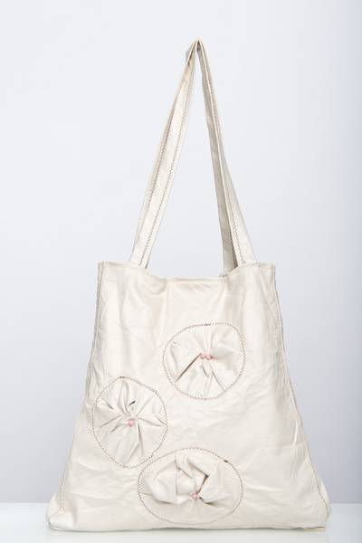 In angenehm weichem gecrashtem Kunstleder verziert mit handgearbeiteten Blumen und farbigen Steppnähten geziert wird diese handliche Tasche ein geschätzter Begleiter im Alltag. Die Tasche ist innen mit rosa Taft gefüttert, in den eine kleine nützliche Innentasche eingesetzt ist.